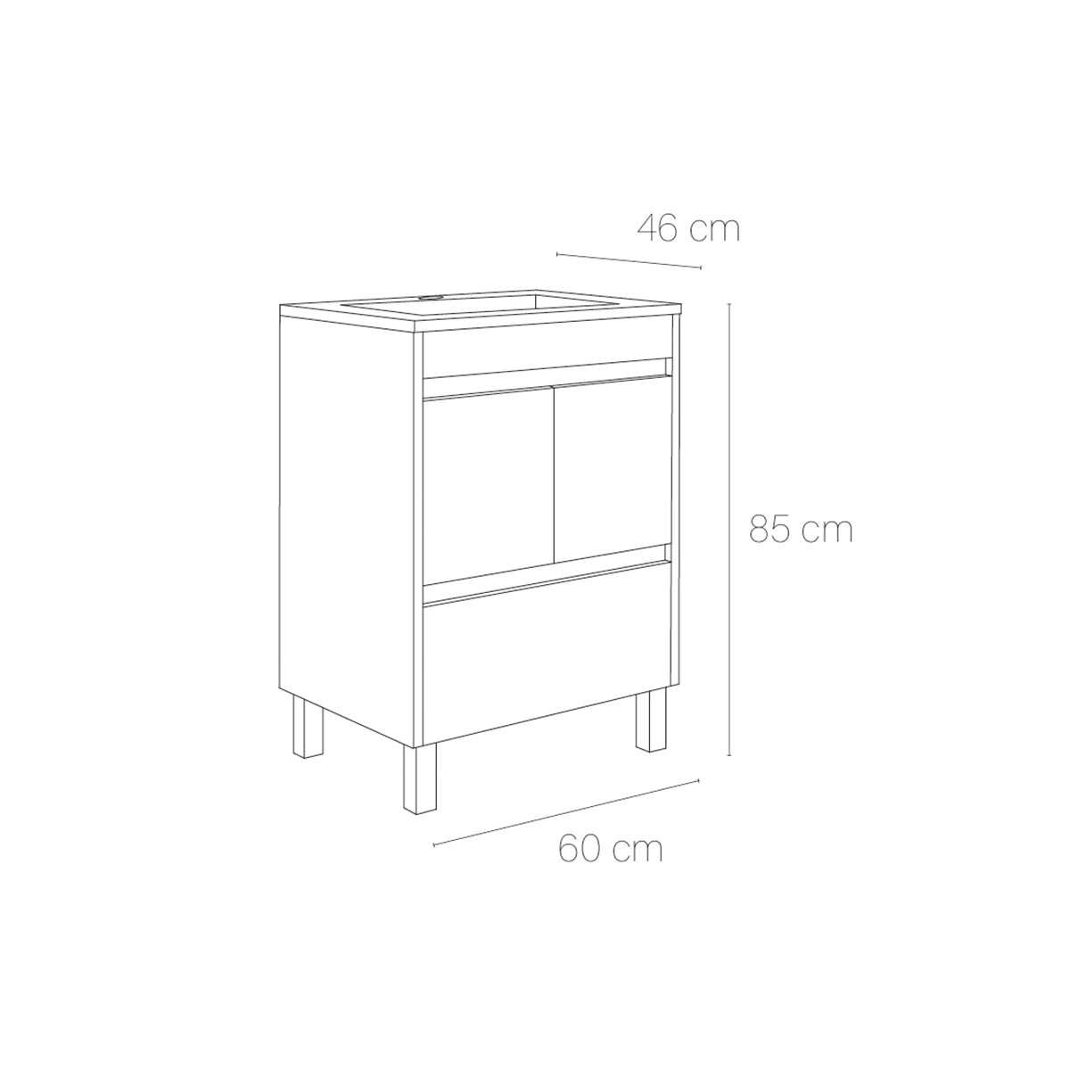 A unidade inclui uma prateleira com duas portas de abrir e uma gaveta, proporcionando uma organização prática e versátil. O seu design sem puxadores, com um mecanismo de abertura ligeiramente embutido, oferece uma estética limpa e moderna. Os quatro pés cromados em ABS reforçam o seu carácter contemporâneo e facilitam a limpeza.