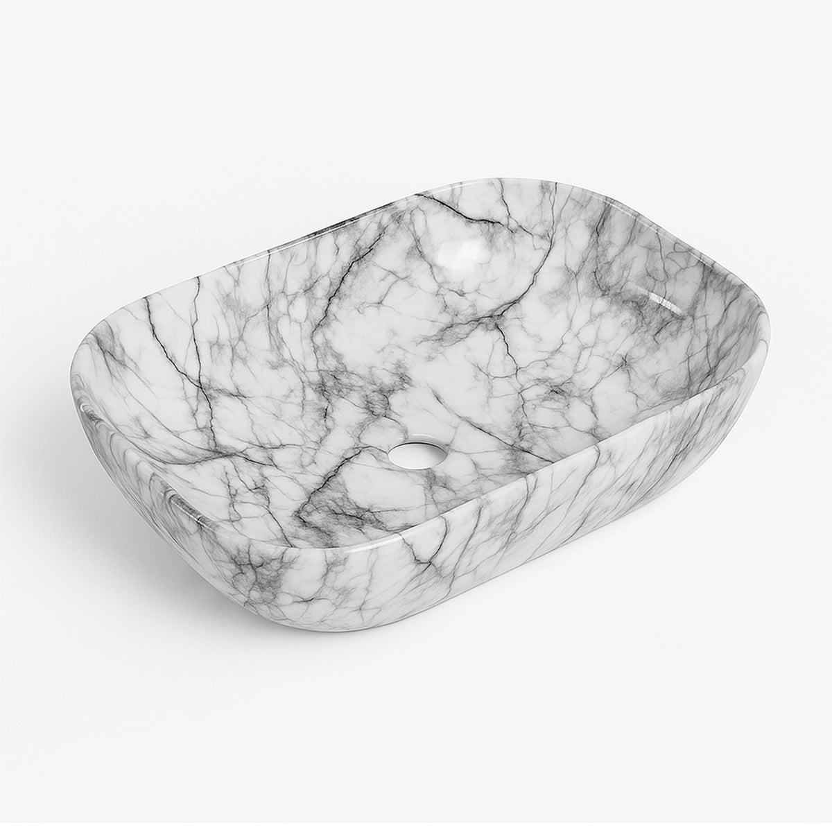 A cuba de bancada Marmolado adiciona um toque sofisticado com seu acabamento brilhante e elegante padrão marmorizado. Disponível em duas cores, é feita de cerâmica de alta qualidade, com textura suave e fácil limpeza. Seu design moderno não inclui válvula, torneira ou furo para torneira, tornando-a ideal para configurações personalizadas e espaços minimalistas.