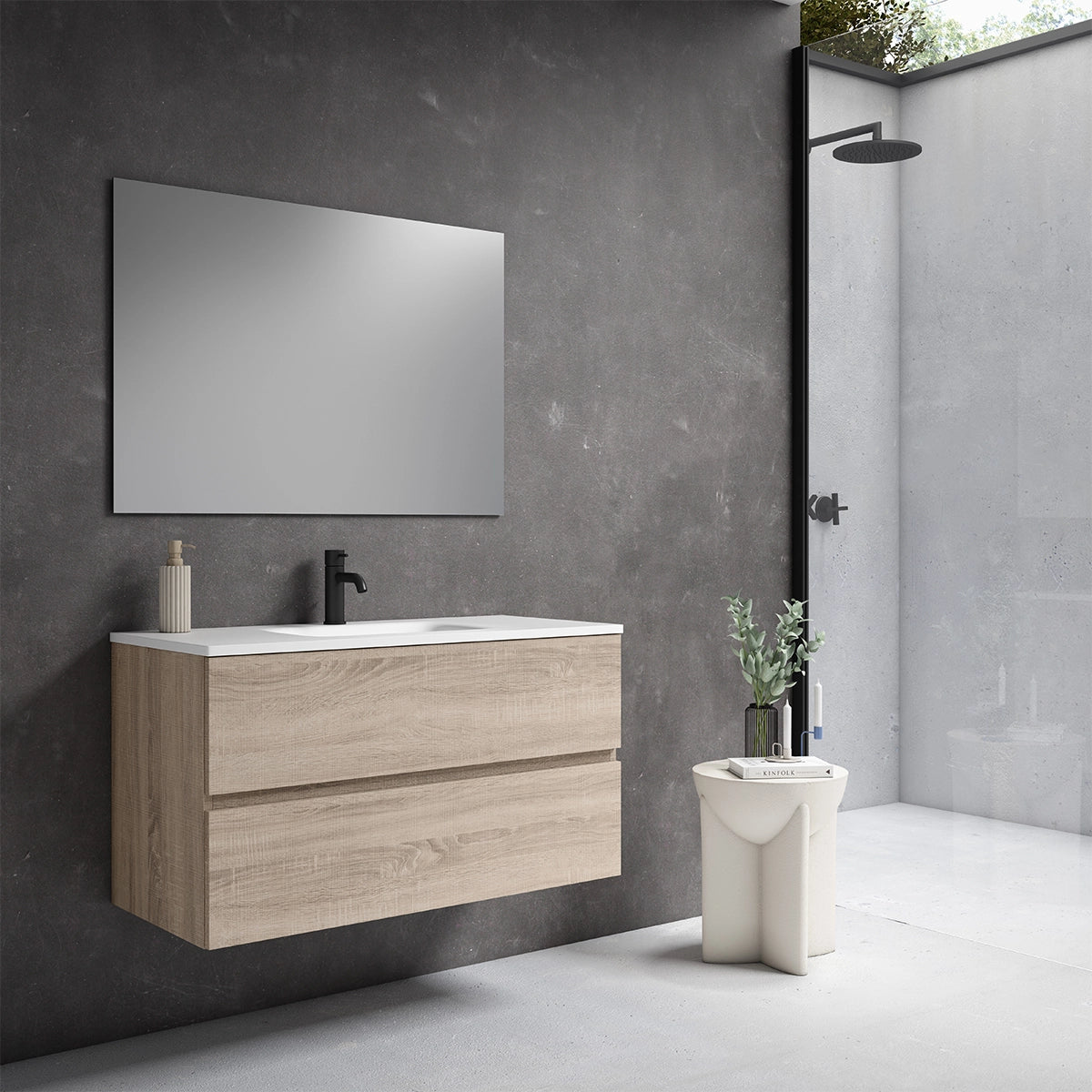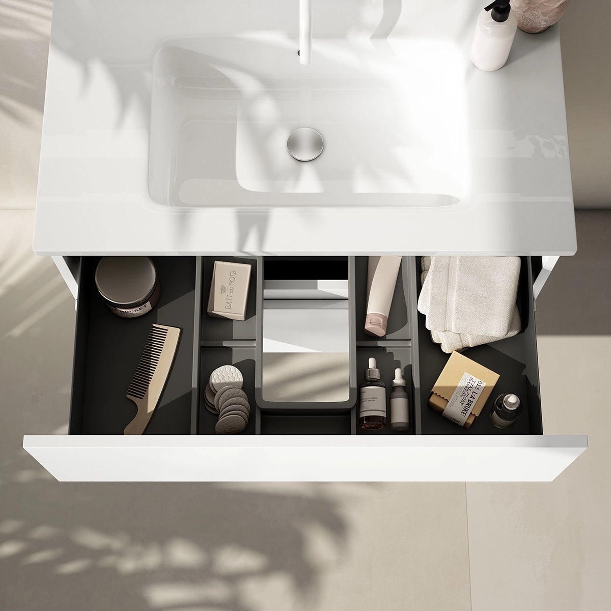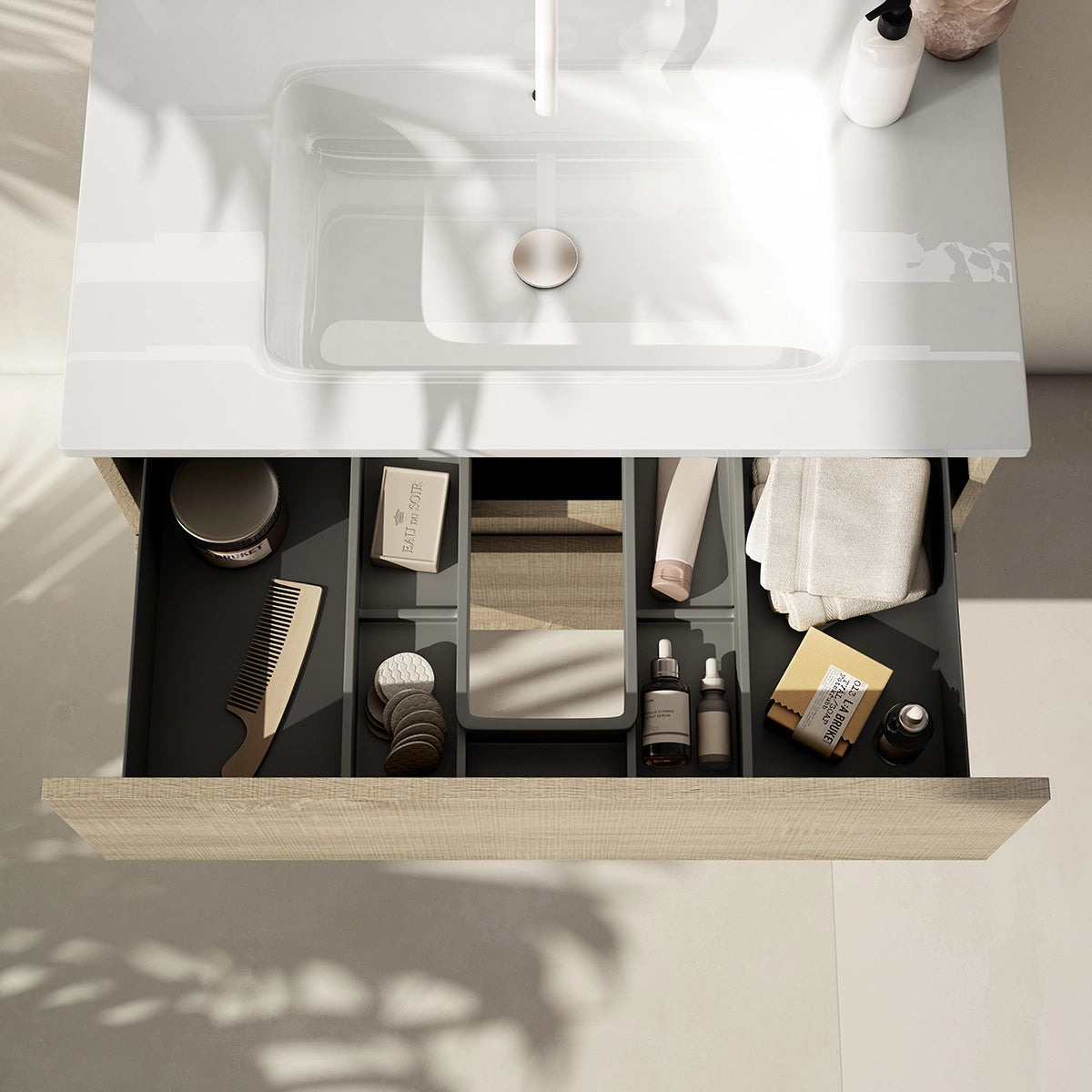 Disponível em carvalho claro com imitação de madeira ou branco brilhante, o móvel de lavatório da Essential Collection adapta-se facilmente a diferentes estilos de decoração.